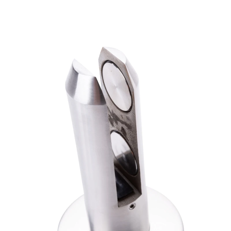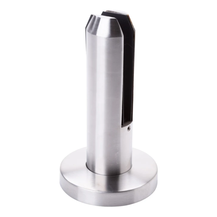 Het bovenste deel van de houder is voorzien van een gespleten pen met twee klembekken, waartussen de glasplaat wordt geplaatst. In de gleuf zijn rubberen afdichtingen aangebracht die het glas stevig vasthouden en beschermen tegen krassen. Hierdoor draagt de constructie belastingen effectief over en garandeert veilig gebruik.