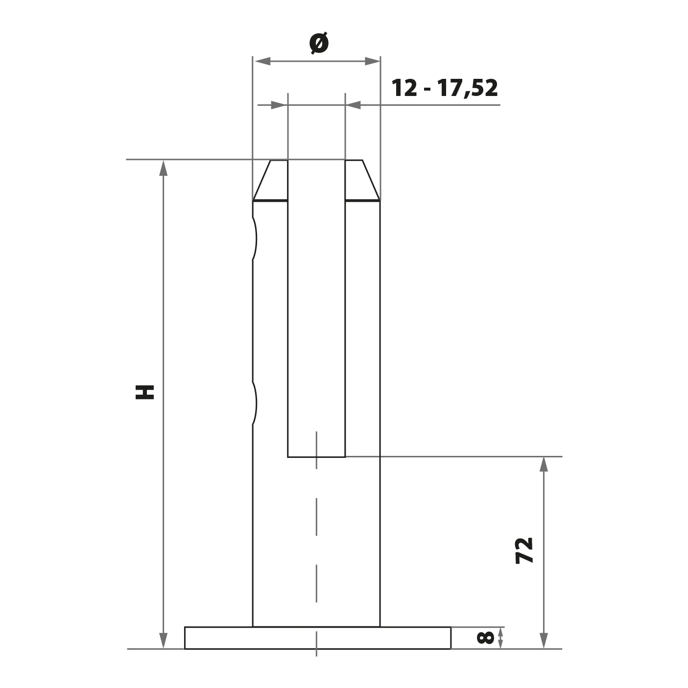 - Insteekdiepte glas: 72 mm (van de onderkant van de voet tot de bodem van de gleuf)