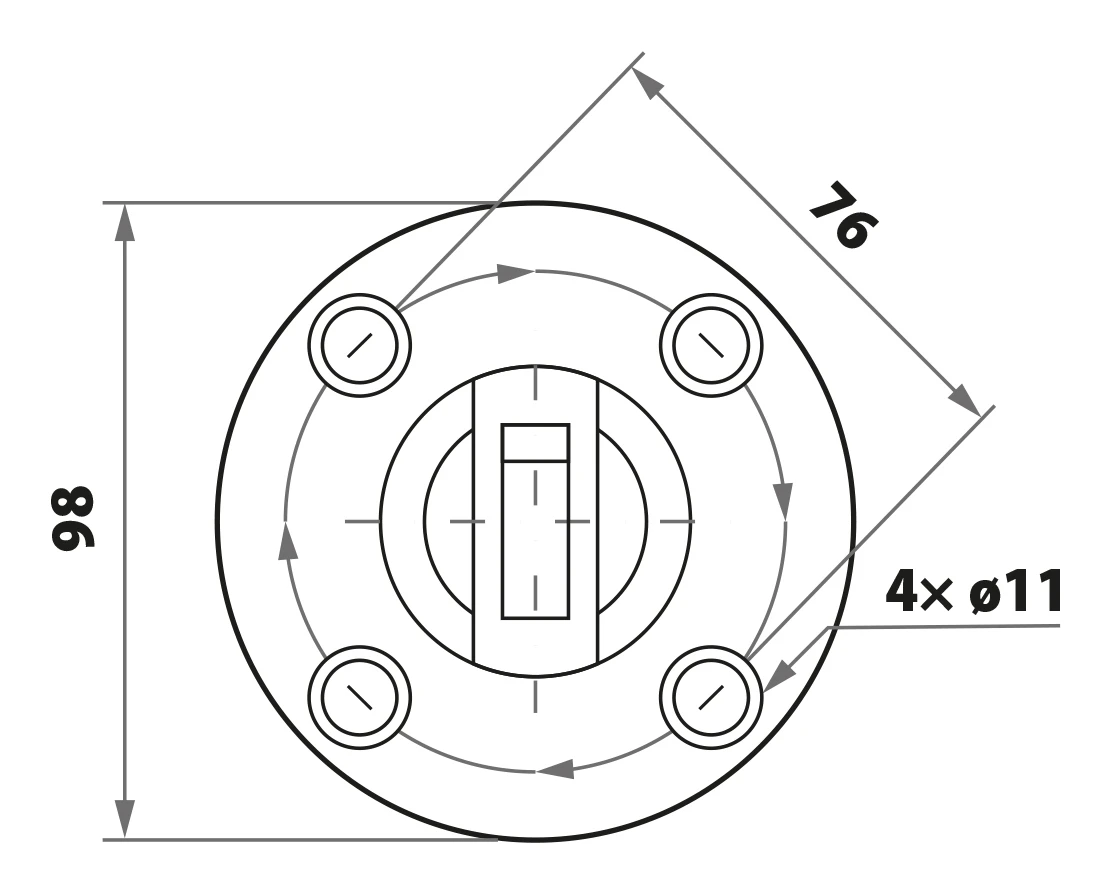 De ronde montagevoet heeft 4 montagegaten met een diameter van ø11 mm, verdeeld over een steekafstand van 76 mm, wat een stevige en symmetrische bevestiging aan de ondergrond mogelijk maakt. De meegeleverde afdekplaat bedekt de schroefkoppen voor een strak en afgewerkt uiterlijk.